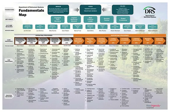 The Fundamentals Map is a single-page image and description of your agency’s mission, objectives, strategies, and processes, complete with process and outcome measures (KPIs or OKRs) and owners. Agency leadership describes it as the single most useful artifact that helps them wrap their arms around the agency’s entire business. Employees describe it as the tool that helps them understand how their daily work impacts the agency’s overall mission and objectives. Ultimately, it serves to align the entire agency by tying its objectives directly to the daily operations.
